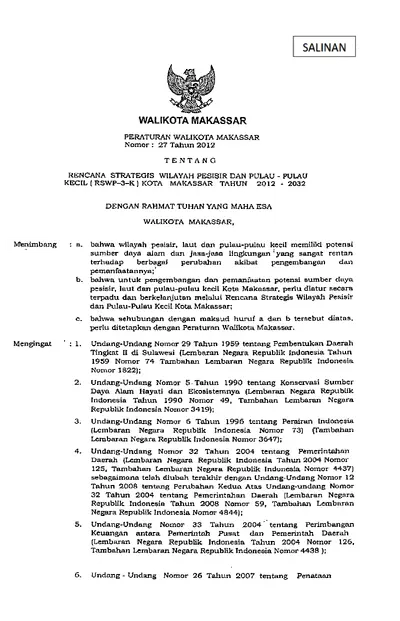 Peraturan Walikota Makassar Nomor 27 Tahun 2012 Tentang Rencana Strategis Wilayah Pesisir Dan Pulau - Pulau Kecil (RSWP-3-K) Kota Makassar Tahun 2012 .............