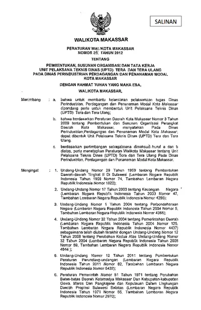 Peraturan Walikota Makassar Nomor 28 Tahun 2012 Tentang Pembentukan, Susunan Organisasi Dan Tata Kerja Unit Pelaksana Teknis Dinas (UPTD) Tera Dan .............