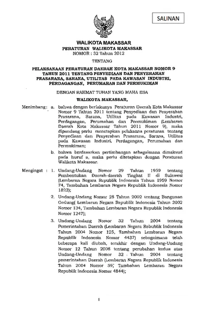 Peraturan Walikota Makassar Nomor 32 Tahun 2012 Tentang Pelaksanaan Peraturan Daerah Kota Makassar Nomor 9 Tahun 2011 Tentang Penyediaan Dan .............