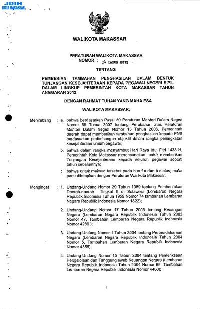 Peraturan Walikota Makassar Nomor 34 Tahun 2012 Tentang Pemberian Tambahan Penghasilan Dalam Bentuk Tunjangan Kesejahteraan Kepada Pegawai Negeri .............