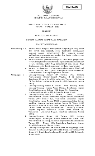 Peraturan Daerah Kota Makassar Nomor 4 Tahun 2011 Tentang Pengelolaan Sampah
