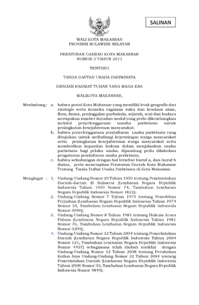 Peraturan Daerah Kota Makassar Nomor 5 Tahun 2011 Tentang Tanda Daftar Usaha Pariwisata