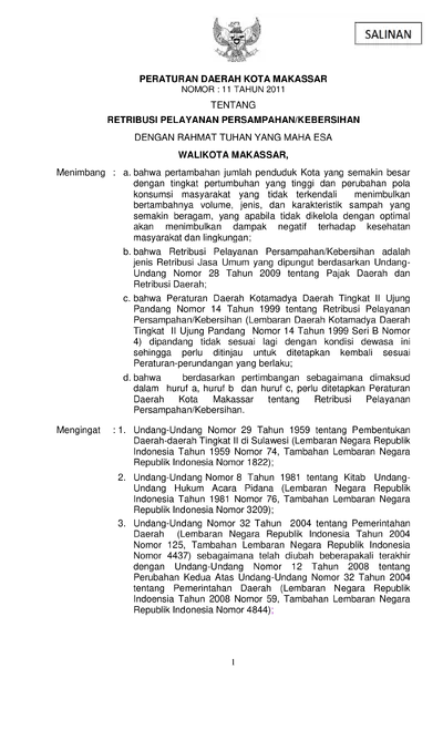 Peraturan Daerah Kota Makassar Nomor 11 Tahun 2011 Tentang Retribusi Pelayanan Persampahan/kebersihan