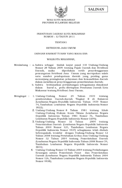 Peraturan Daerah Kota Makassar Nomor 12 Tahun 2011 Tentang Retribusi Jasa Umum