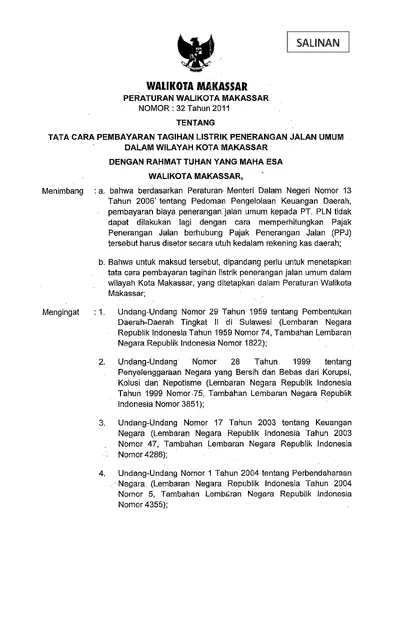 Peraturan Walikota Makassar Nomor 32 Tahun 2011 Tentang Tata Cara Pembayaran Tagihan Listrik Penerangan Jalan Umum Dalam Wilayah Kota Makassar