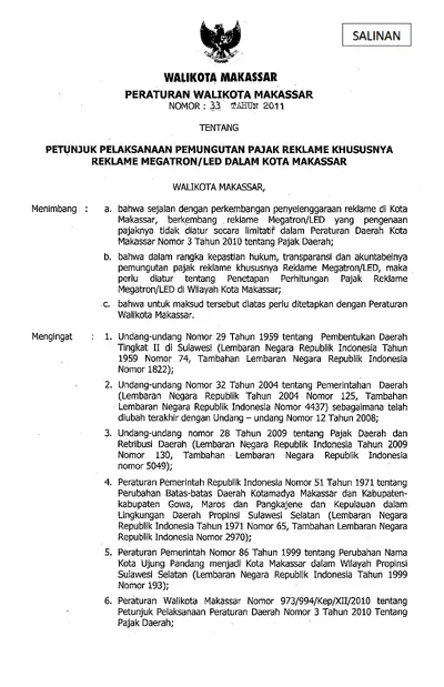 Peraturan Walikota Makassar Nomor 33 Tahun 2011 Petunjuk Teknis Pelaksanaan Pemungutan Pajak Reklame Khususnya Reklame Megatron/led Dalam Kota .............