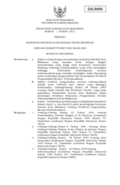 Peraturan Daerah Kota Makassar Nomor 1 Tahun 2011 Tentang Retribusi Pengendalian Menara Telekomunikasi
