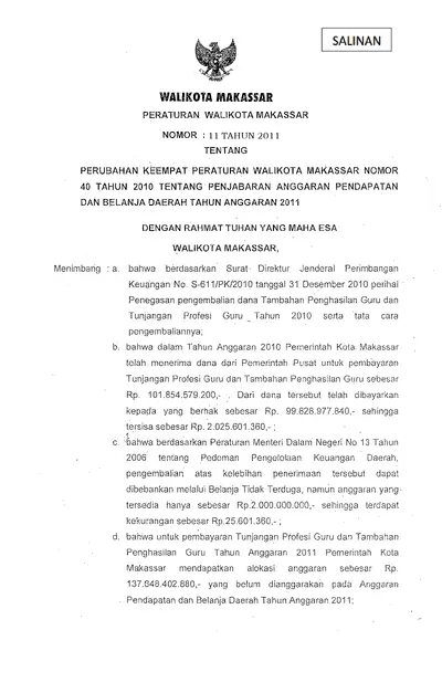 Peraturan Walikota Makassar Nomor 11 Tahun 2011 Tentang Perubahan Keempat Peraturan Walikota Makassar Nomor 40 Tahun 2010 Tentang Penjabaran Anggaran .............