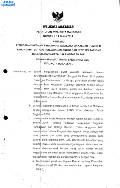 Peraturan Walikota Makassar Nomor 14 Tahun 2011 Tentang Perubahan Keenam Peraturan Walikota Makassar Nomor 40 Tahun 2010 Tentang Penjabaran Anggaran .............