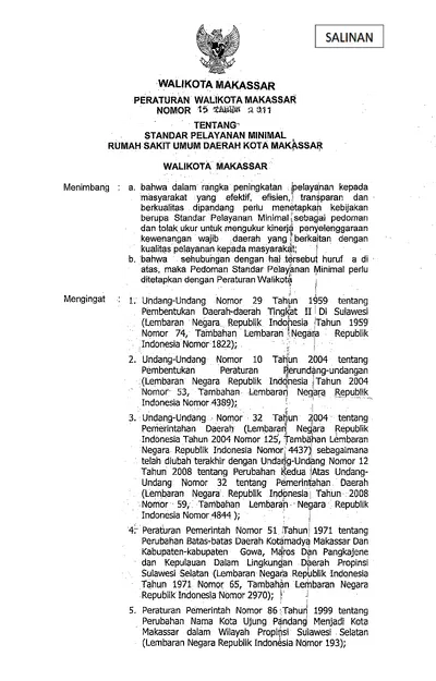 Peraturan Walikota Makassar Nomor 15 Tahun 2011 Tentang Standar Pelayanan Minimal Rumah Sakit Umum Daerah Kota Makassar
