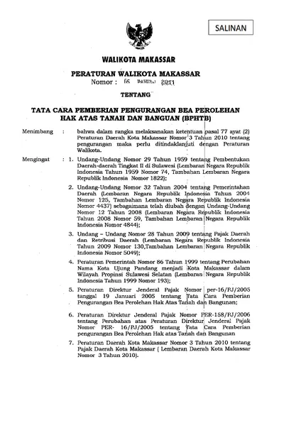 Peraturan Walikota Makassar Nomor 16 Tahun 2011 Tentang Tata Cara Pemberian Pengurangan Bea Perolehan Hak Atas Tanah Dan Bangunan (BPHTB)
