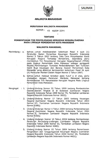 Peraturan Walikota Makassar Nomor 17 Tahun 2011 Tentang Pembentukan Tim Penyelesaian Kerugian Negara/Daerah Pada Lingkup Pemerintah Kota Makassar