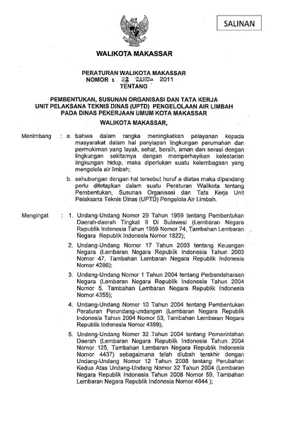 Peraturan Walikota Makassar Nomor 23 Tahun 2011 Tentang Pembentukan, Susunan Organisasi Dan Tata Kerja Unit Pelaksana Teknis Dinas (uptd) Pengelolaan .............
