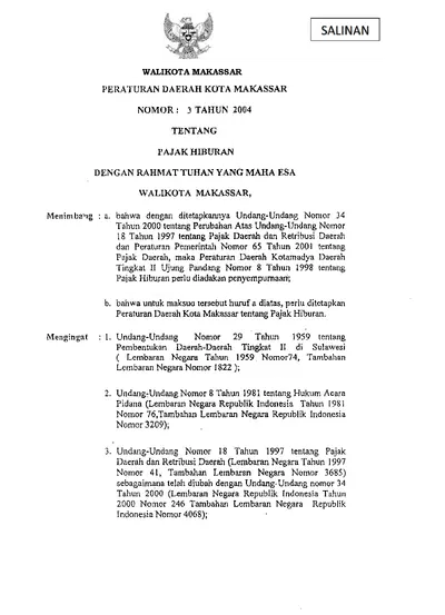 Peraturan Daerah Kota Makassar Nomor 3 Tahun 2004 Tentang Pajak Hiburan