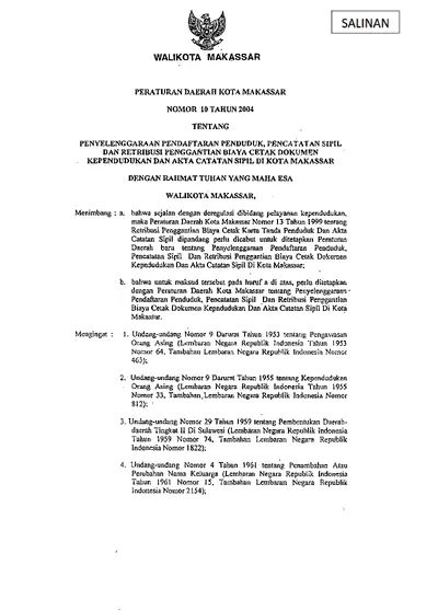 Peraturan Daerah Kota Makassar Nomor 10 Tahun 2004 Tentang Penyelenggaraan Pendaftaran Penduduk, Pencatatan Sipil Dan Retribusi Penggantian Biaya .............