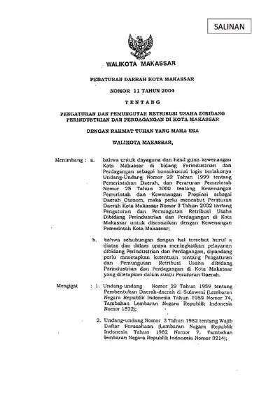Peraturan Daerah Kota Makassar Nomor 11 Tahun 2004 Tentang Pengaturan Dan Pemungutan Retribusi Usaha Dibidang Perindustrian Dan Perdagangan Di Kota .............