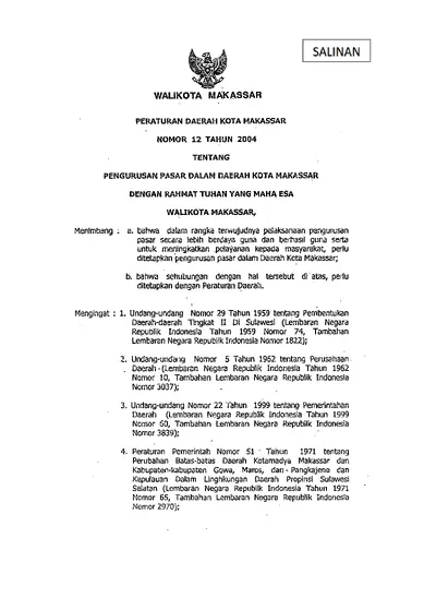 Peraturan Daerah Kota Makassar Nomor 12 Tahun 2004 Tentang Pengurusan Pasar Dalam Daerah Kota Makassar