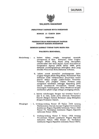 Peraturan Daerah Kota Makassar Nomor 13 Tahun 2004 tentang Pembentukan Perusahaan Daerah Bangun Sarana Makassar