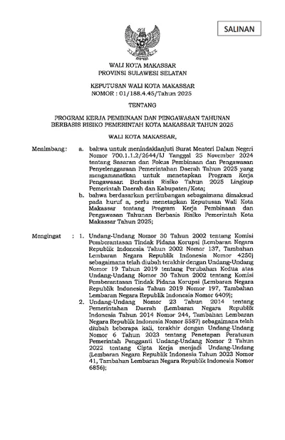 Keputusan Walikota Makassar Nomor 1/188.45/tahun 2025 Tentang Program Kerja Pembinaan Dan Pengawasan Tahunan Berbasis Risiko Pemerintah Kota Makassar .............