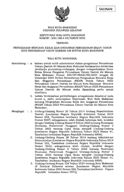 Keputusan Walikota Makassar Nomor 206/188.4.45/Tahun 2025 Tentang Pengesahan Rencana Kerja Dan Anggaran Perusahaan (RKAP) Tahun 2025 Perusahaan Umum .............