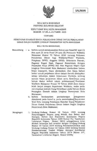 Keputusan Wali Kota Makassar Nomor 3/188.4.45/Tahun 2025 Tentang Penetapan Standar Biaya Perjalanan Dinas Untuk Perjalanan Dinas Dalam Negeri Lingkup .............