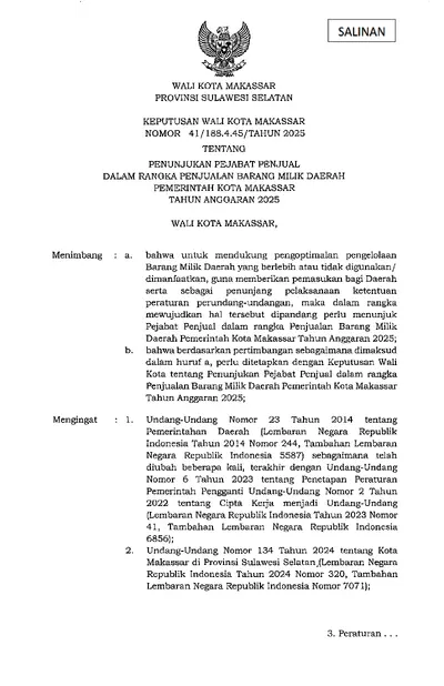Keputusan Wali Kota Makassar Nomor 41 Tahun 2025 Tentang Penunjukan Pejabat Penjual Dalam Rangka Penjualan Barang Milik Daerah Pemerintah Kota .............