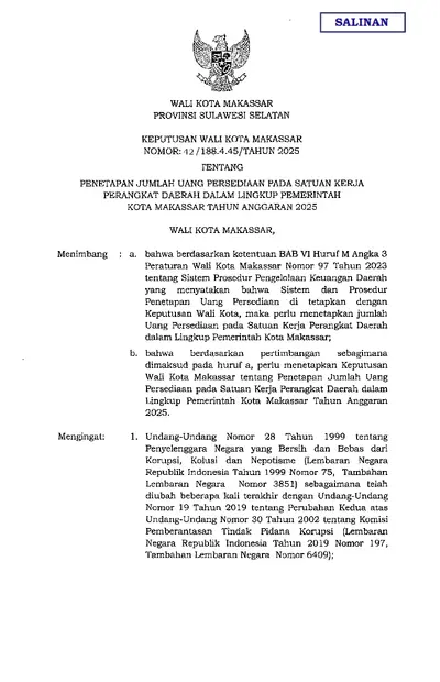Keputusan Wali Kota Makassar Nomor 42 Tahun 2025 Tentang Penetapan Jumlah Uang Persediaan Pada Satuan Kerja Perangkat Daerah Dalam Lingkup Pemerintah .............