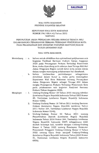 Keputusan Wali Kota Makassar Nomor 396 Tahun 2025 Tentang Penunjukan Jaksa Pengacara Negara Sebagai Tenaga Ahli Dalam Rangka Penanganan Perkara .............