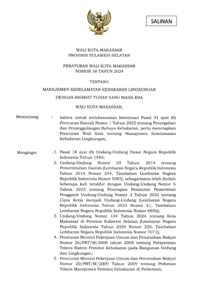 Peraturan Wali Kota Makassar Nomor 58 Tahun 2024 Tentang Manajemen Keselamatan Kebakaran Lingkungan