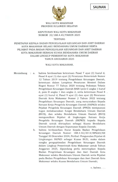 Keputusan Walikota Makassar Nomor 22/188.4.45/Tahun 2025 Tentang Penetapan Kepala Badan Pengelolaan Keuangan Dan Aset Daerah Kota Makassar Selaku .............