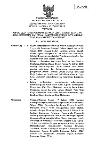Keputusan Walikota Makassar Nomor 32/188.4.45/tahun 2025 Tentang Penunjukan Pemimpin Badan Layanan Umum Daerah Pada Unit Kerja Puskesmas Dan Rumah .............