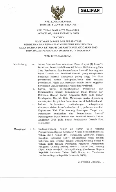 Keputusan Walikota Makassar Nomor 67 Tahun 2025 Tentang Penetapan Target Dan Persentase Pemberian Dan Pemanfaatan Insentif Pemungutan Pajak Daerah .............