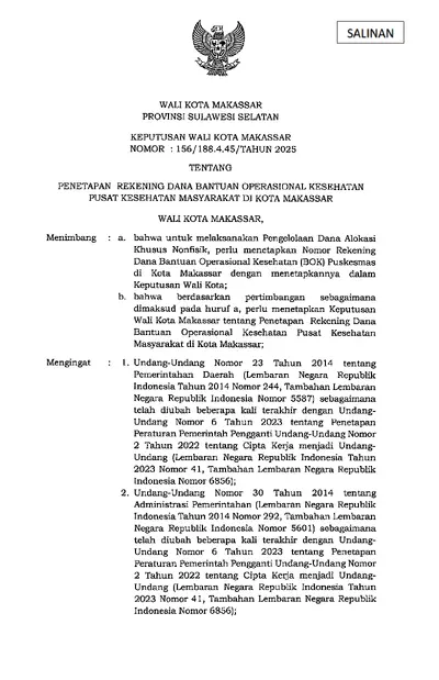 Keputusan Walikota Makassar Nomor 156/188.4.45/Tahun 2025 Tentang Penetapan Rekening Dana Bantuan Operasional Kesehatan Pusat Kesehatan Masyarakat Di .............