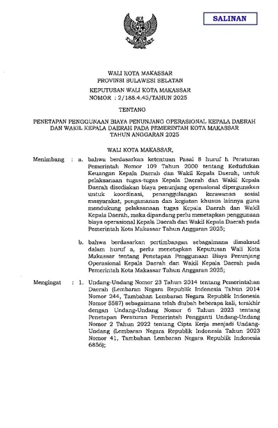 Keputusan Wali Kota Makassar Nomor 2 Tahun 2025 Tentang Penetapan Penggunaan Biaya Penunjang Operasional Kepala Daerah Dan Wakil Kepala Daerah Pada .............