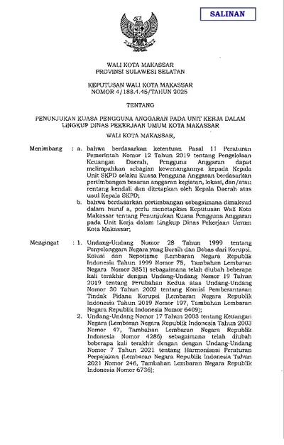 Keputusan Wali Kota Makassar Nomor 4 Tahun 2025 Tentang Penunjukan Kuasa Pengguna Anggaran Pada Unit Kerja Dalam Lingkup Dinas Pekerjaan Umum Kota .............