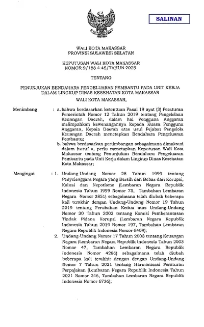 Keputusan Wali Kota Makassar Nomor 9 Tahun 2025 Tentang Penunjukan Bendahara Pengeluaran Pembantu Pada Unit Kerja Dalam Lingkup Dinas Kesehatan Kota .............