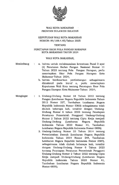 Keputusan Wali Kota Makassar Nomor 89 Tahun 2025 Tentang Penetapan Skor Pola Pangan Harapan Kota Makassar Tahun 2024