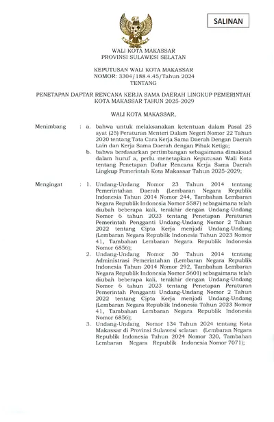 Keputusan Walikota Makassar Nomor 3304/188.4.45/Tahun 2024 Tentang Penetapan Daftar Rencana Kerja Sama Daerah Lingkup Pemerintah Kota Makassar Tahun .............