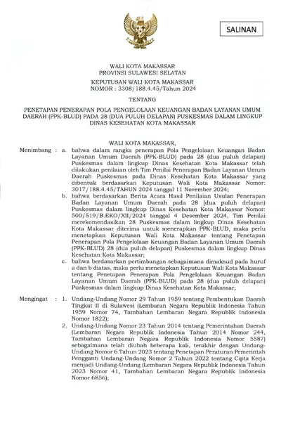 Keputusan Walikota Makassar Nomor 3308/188.4.45/Tahun 2024 Tentang Penetapan Penerapan Pola Pengelolaan Keuangan Badan Layanan Umum Daerah (PPK-BLUD) .............