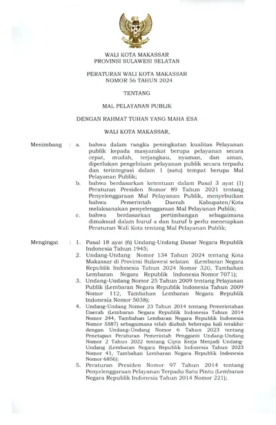 Peraturan Wali Kota Makassar Nomor 56 Tahun 2024 Tentang Mal Pelayanan Publik
