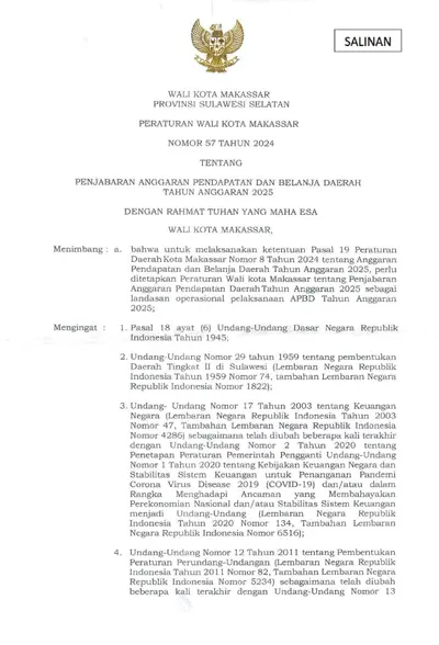 Peraturan Walikota Makassar Nomor 57 Tahun 2024 Tentang Penjabaran Anggaran Pendapatan Dan Belanja Daerah Tahun Anggaran 2025