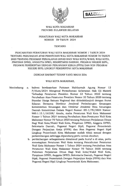 Peraturan Walikota Makassar Nomor 59 Tahun 2024 Tentang Pencabutan Peraturan Wali Kota Makassar Nomor 1 Tahun 2024 Tentang Perubahan Atas Peraturan .............