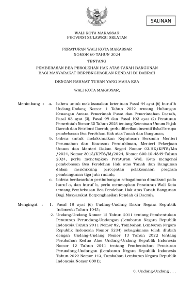 Peraturan Walikota Makassar Nomor 60 Tahun 2024 Tentang Pembebasan Bea Perolehan Hak Atas Tanah Bangunan Bagi Masyarakat Berpenghasilan Rendah Di .............