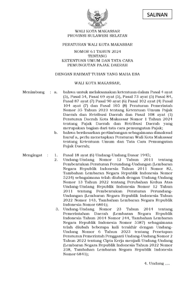 Peraturan Walikota Makassar Nomor 61 Tahun 2024 Tentang Ketentuan Umum Dan Tata Cara Pemungutan Pajak Daerah