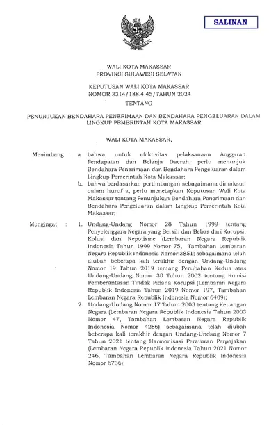 Keputusan Wali Kota Makassar Nomor 3314 Tahun 2024 Tentang Penunjukan Bendahara Penerimaan Dan Bendahara Pengeluaran Dalam Lingkup Pemerintah Kota .............