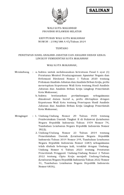 Keputusan Walikota Makassar Nomor 2198/188.4.45/tahun 2024 Tentang Penetapan Hasil Analisis Jabatan Dan Analisis Beban Kerja Lingkup Pemerintah Kota .............