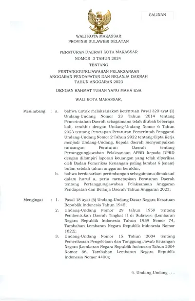 Peraturan Daerah Kota Makassar Nomor 3 Tahun 2024 Tentang Pertanggungjawaban Pelaksanaan Anggaran Pendapatan Dan Belanja Daerah Tahun Anggaran 2023
