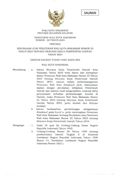 Peraturan Wali Kota Makassar Nomor 30 Tahun 2024 Tentang Perubahan Atas Peraturan Walikota Nomor 25 Tahun 2023 Tentang Rencana Kerja Pemerintah .............