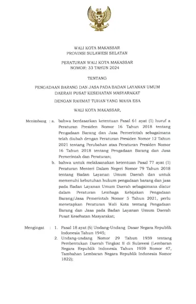 Peraturan Wali Kota Makassar Nomor 33 Tahun 2024 Tentang Pengadaan Barang Dan Jasa Pada Badan Layanan Umum Daerah Pusat Kesehatan Masyarakat