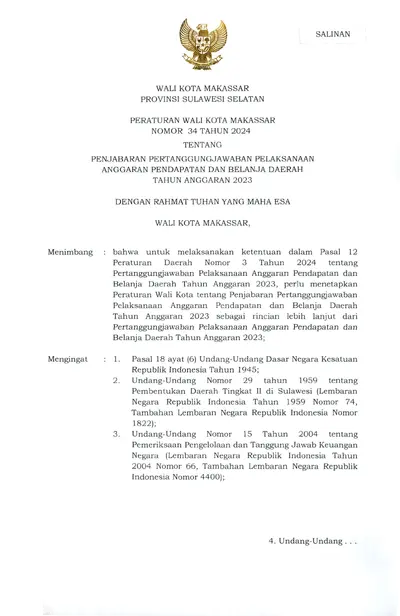 Peraturan Wali Kota Makassar Nomor 34 Tahun 2024 Tentang Penjabaran Pertanggungjawaban Pelaksanaan Anggaran Pendapatan Dan Belanja Daerah Tahun .............